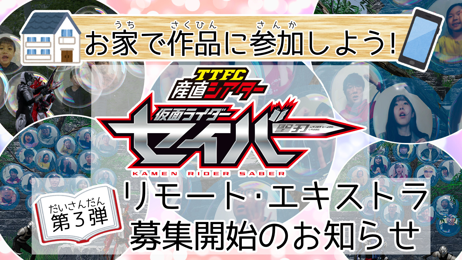 ================= みんなで仮面ライダーセイバーを応援しよう!! 『TTFC産直シアター 仮面ライダーセイバー 第3幕』リモート・エキストラ応募開始! ================= 応募期間は、6月13日(日)10:00~6月30日(水)23:59まで! ご応募お待ちしております!! この企画ではTTFC会員の皆様に「リモート・エキストラ」と...