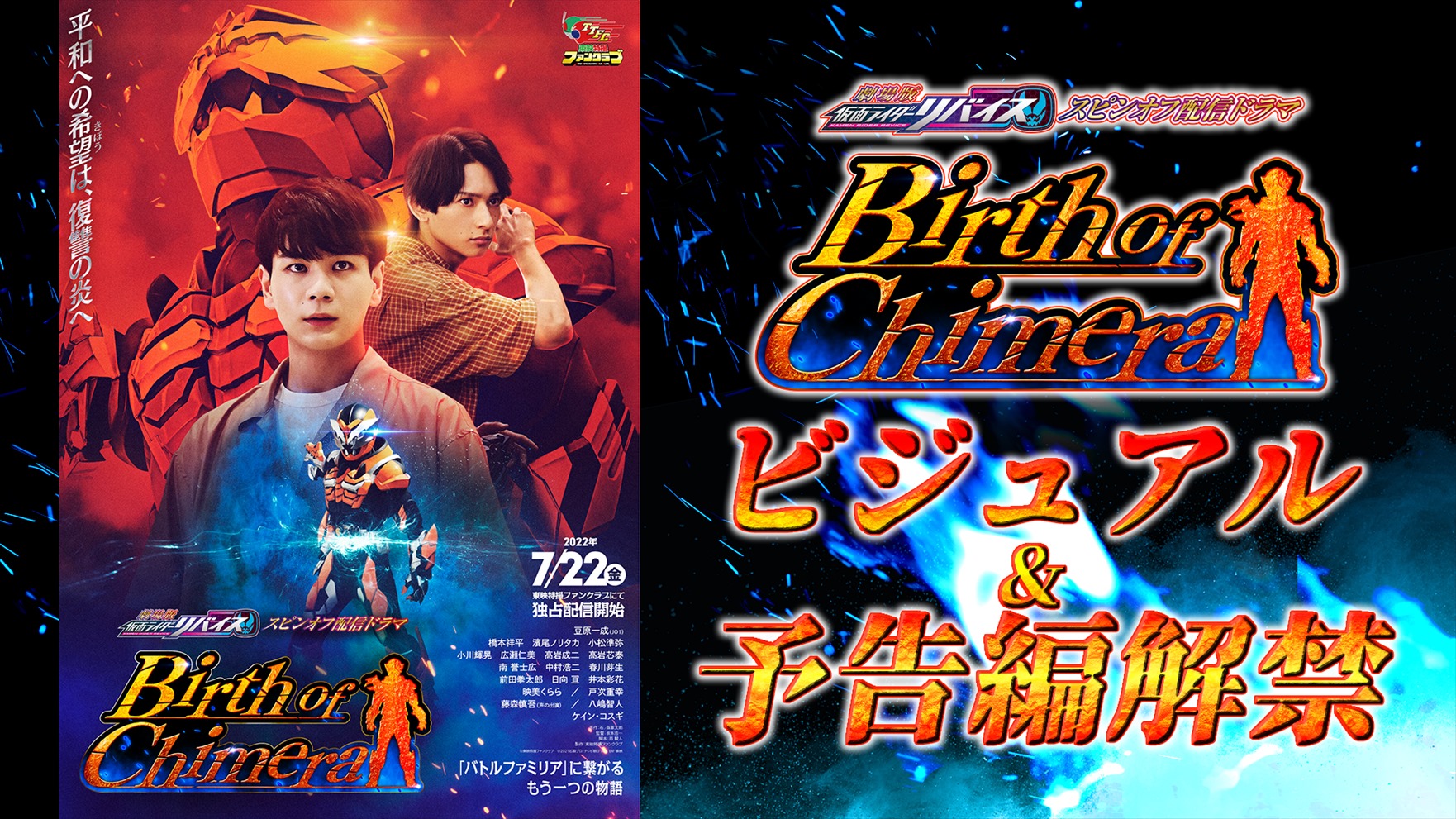 ======== 「劇場版 仮面ライダーリバイス」 スピンオフ配信ドラマ 「Birth of Chimera」 ビジュアル&予告映像解禁!! ======== 7月22日(金)より東映特撮ファンクラブ(TTFC)にて配信開始となる 『「劇場版 仮面ライダーリバイス」スピンオフ配信ドラマ「Birth of Chimera」』 のビジュアル&予告編が解禁! すべてはこの「Bi...