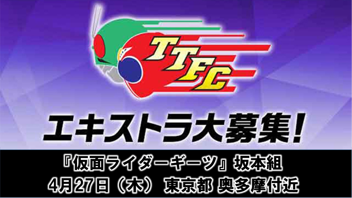 『仮面ライダーギーツ』の撮影に、ボランティアでご参加頂けるエキストラの方を募集致します。 ご応募は東映特撮ファンクラブ会員(有料)の方限定となります。 下記募集要項をご確認の上、参加を希望される方は東映特撮ファンクラブアプリ内の応募フォームよりご応募ください。※当日確実に参加頂ける方のみご応募ください。 =========================== ■募集要項 【...