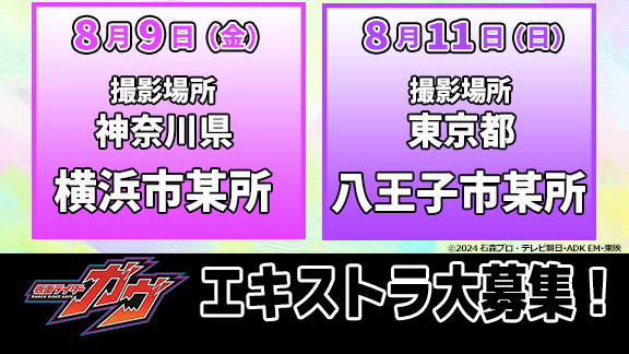 『仮面ライダーガヴ』の撮影に、ボランティアでご参加頂けるエキストラの方を募集致します。 ご応募は東映特撮ファンクラブ会員(有料)の方限定となります。 下記募集要項をご確認の上、参加を希望される方は東映特撮ファンクラブアプリ内の応募フォームよりご応募ください。※当日確実に参加頂ける方のみご応募ください。 それぞれの募集内容は下記になります。 ++++++++++++++++++++++...