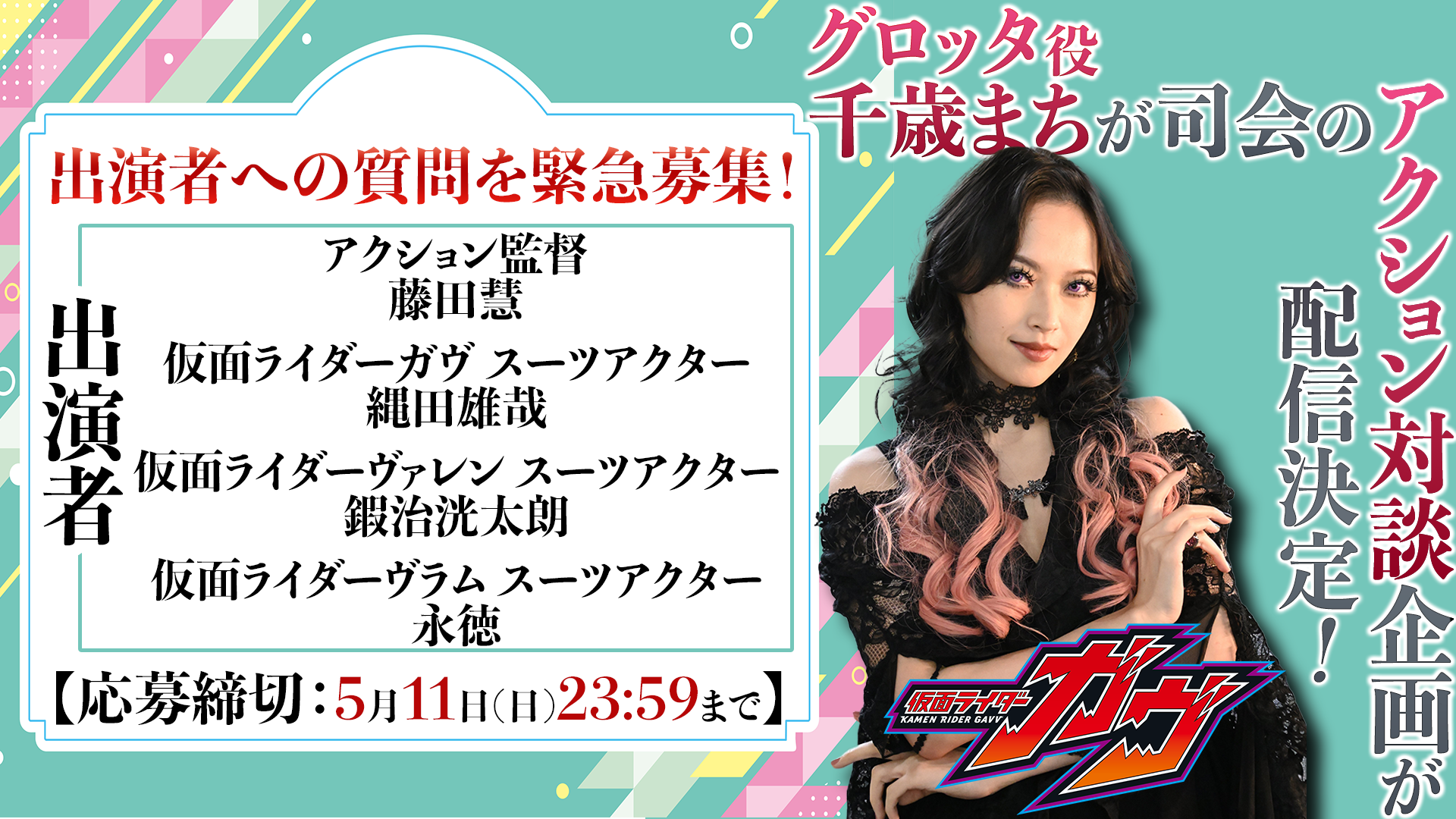 東映特撮ファンクラブ(TTFC)では、『仮面ライダーガヴ』(毎週日曜午前9時よりテレビ朝日系にて放送)と連動して、様々なオリジナルコンテンツを配信中! この度、【千歳まち(グロッタ・ストマック役)】が司会を務め、【藤田慧(アクション監督)】、【縄田雄哉(仮面ライダーガヴ スーツアクター)】、【鍜治洸太朗(仮面ライダーヴァレン スーツアクター)】、【永徳(仮面ライダーヴラム スーツアクター)...