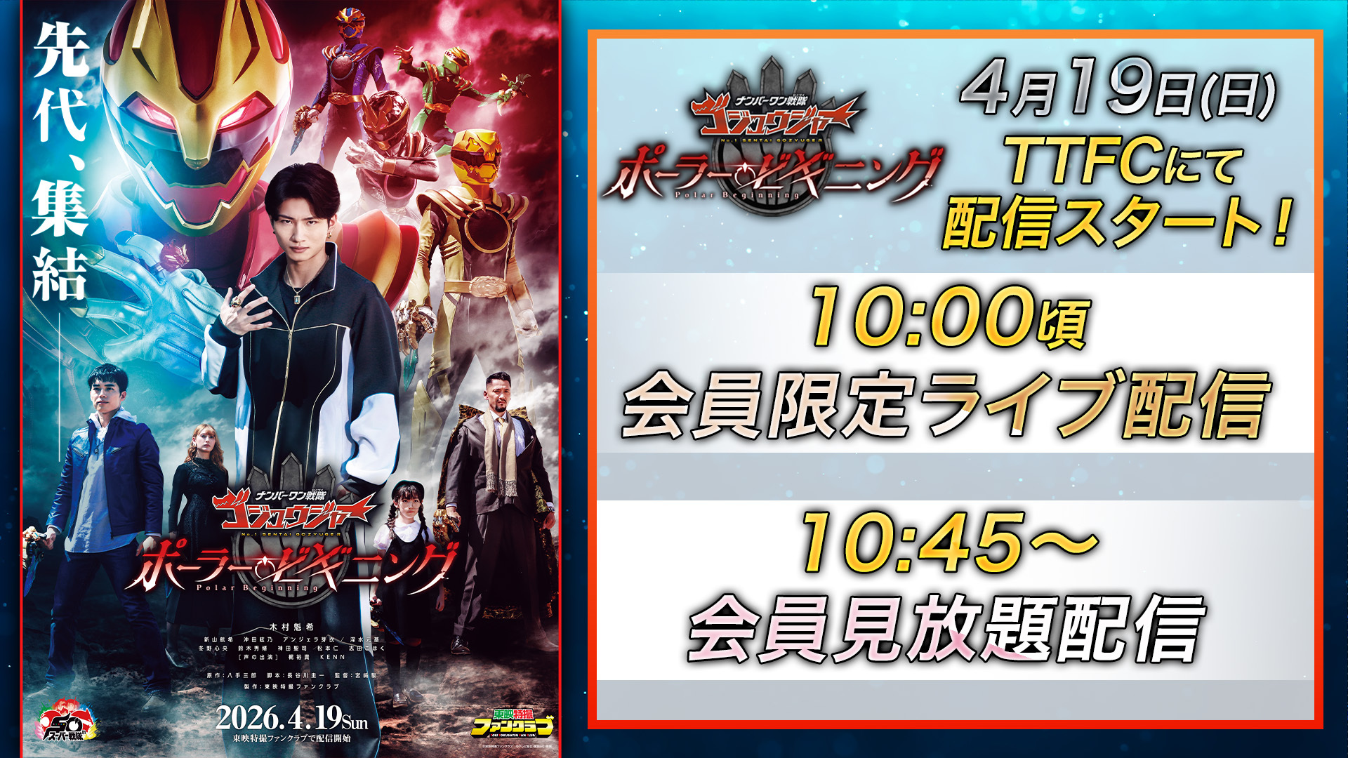 TTFCオリジナル『ナンバーワン戦隊ゴジュウジャー ポーラー・ビギニング』が、いよいよ4月19日(日)10時頃より東映特撮ファンクラブ(TTFC)でライブ配信&10時45分から見放題配信開始!